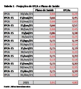 Se o mesmo ocorresse a partir de maio, nossa projeção para o IPCA de 2021 seria reduzida em 30bps, de 5,1% para 4,8%.