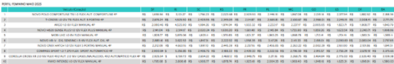 - Novo Polo Comfortline TSI 1.0 Flex Aut.: Presente entre os carros mais vendidos desde o início do ano, o modelo se manteve no topo da lista pelo segundo mês consecutivo. Para os homens, o preço médio das apólices foi de R$2.144,48 em maio, apresentando uma estabilidade em relação a abril (R$2.119,85). Para as mulheres, o valor reduziu em quase todas as capitais, exceto em Vitória (+35%) e Curitiba (+27%).