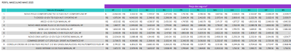 - Novo HB20 Sense 1.0 Flex Manual: Único modelo do ranking com queda no valor médio do seguro entre os homens, o HB20 teve recuo de -1,9% (de R$1.800,79 em abril para R$1.763,44 em maio). No público feminino, a direção foi oposta: o custo subiu 1,8%, passando de R$1.954,38 para R$1.990,11. A queda para os homens foi puxada por Salvador, Recife e Porto Alegre, enquanto os aumentos entre as mulheres foram mais distribuídos.