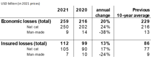 US﹩ 105 bilhões, a quarta maior alta desde 1970, de acordo com as estimativas do sigma preliminar do Swiss Re Institute. Embora o furacão Ida tenha sido o desastre natural mais caro em 2021, a tempestade de inverno Uri e outros eventos secundários causaram mais da metade das perdas totais, pois o acúmulo de riqueza e os efeitos da mudança climática em áreas sujeitas a desastres geraram reivindicações. Desastres provocados pelo homem geraram outros