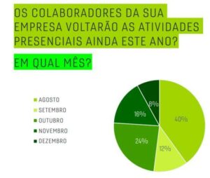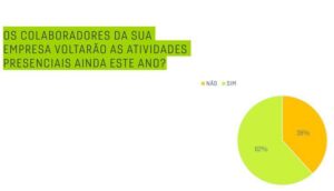 A pesquisa revela que, 82% das empresas que pretendem retomar o farão de forma híbrida, 16% voltarão totalmente presencial e 2% permanecerão em modelo totalmente home office.