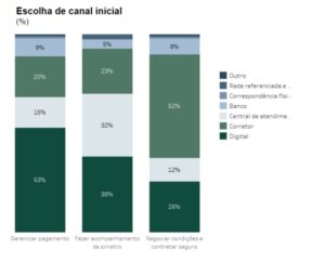 Os níveis de satisfação do cliente variam de acordo com o tipo de episódio. Aquisição, por exemplo, ainda são dependentes do corretores, que são o canal inicial de 52% dos clientes. Enquanto gerenciamento de pagamento e acompanhamento de sinistro possuem maior penetração de canais digitais (53%), seguido de central de atendimento (38%).