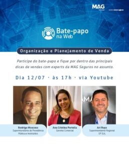 Na próxima segunda-feira (12), a MAG Seguros, companhia de 186 anos especializada em seguro de vida e previdência, reunirá experts para compartilhar seus conhecimentos e debater técnicas de vendas. Estarão presentes Ana Cristina Portella, gerente comercial da seguradora, Ari Ruys, superintendente Regional SP/Sul, e Rodrigo Moscoso, superintendente de Previdência Pública e Instituídos. A live será transmitida no canal do Youtube da seguradora, a partir das 17 horas.
